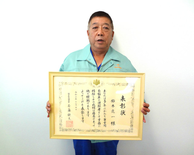 当社の神戸支店乗務員鈴木亮一さんが、自動車関係事業に多年精励し功績顕著である者として、