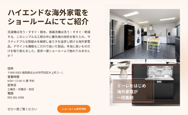 家電事業部はミーレをはじめ世界的ブランド家電を取扱う代理店であり、九州全域および中国地方を営業エリアとして活動しています。また、北九州ショールームに厳選した家電を展示実演しております。